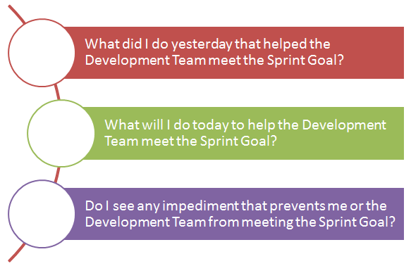 Each team member is expected to talk about three basic things. By talk, I do not mean go on and on about your accomplishments or issues, its a quick talk to let your peers know what you have done so far and what you intend to take up next and if you are impeded in any way.