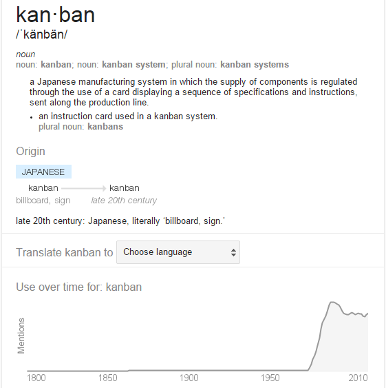 Dictionary meaning of Kanban (ref: dictionary.com) – a just-in-time method of inventory control, originally developed in Japanese automobile factories. Japanese, kamban literally, ‘signboard, shopkeeper’s in-business sign’, probably alluding to the shop or tavern keeper’s final call for orders beforetaking the sign down, hence ‘last-minute, just in time’ in the context of inventory control. Middle Chinese, equivalent to Chinese kàn ‘look’ + bǎn‘printing block’